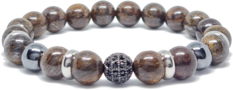 Kiváló minőségű valódi bronzit ásványból készült ásvány karkötő. A bronzit karkötő mély barna és arany árnyalatai kifinomult megjelenést kölcsönöznek, miközben segít a bátorság és a határozottság érzésének erősítésében. A karkötő valódi bronzit, hematit 8-9 mm ásványból és nemesacél köztes cirkón gömb dísszel készült. Az ásvány, karkötő form