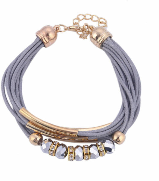 Többrétegű fémgyöngyös karkötő, szürke-arany. Állítható méret. Divatos, trendi, feltűnő. Fémötvözet és műbőr. Egy jól megválasztott ékszer öltöztet, feldobja a napodat, valahányszor ránézel, jobb kedvre derülsz. A színekkel és anyagokkal manapság könnyű variálni a különböző stílusokat, nem kell ragaszkodni a hagyományos szettekhez, nem feltétlenül kell a