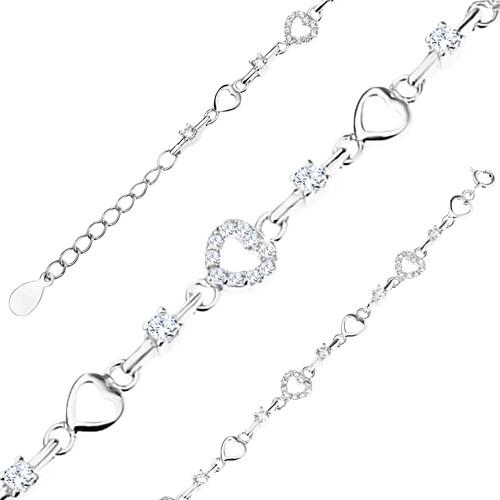 925 ezüst karkötő, váltakozó elemekből fényes szív körvonal, cirkóniás szív és egyenes vonal, amely közepén helyezkedik el egy átlátszó cirkónia. Állítható hossz, delfinkapoccsal záródik. Karkötő szélessége: 7 mmKarkötő hossza: 165 mmHosszabbítható rész: 30 mmKarkörő súlya: 6,25 gFémjelzéssel ellátott.