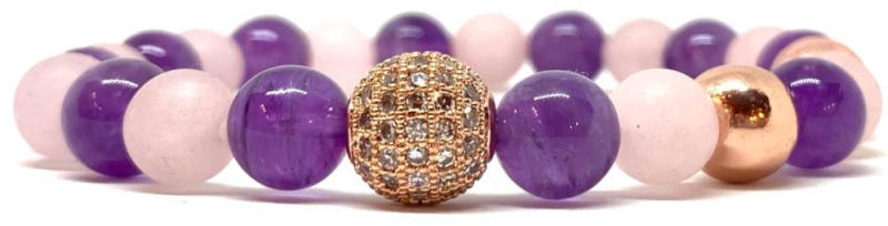 Cirkón gyöngy díszítésű Shamballa ásvány karkötő A 8mm-es Rózsakvarc és Ametiszt ásvány golyós karkötők speciális gumis damilra vannak fűzve, rózsaarany cirkón golyó köztes díszítéssel. Amit a Rózsakvarc ásványról tudni kell: A festetlen rózsakvarc az egész világos, szinte áttetszőtől, a ködös középrózsaszínig terjed. Az egyik legnépszerűbb kövek egyike