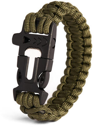 A minőségi parakord karkötő 350 cm hosszú, 2,5 cm széles és 20 cm hosszú. Ideális túléléshez, túrázáshoz vagy mindennapi viselethez. Kibogozva remek minőségű kötélként használható. Anyaga műanyag csat és nylon kötél. Előnyei közé tartozik a műanyag csat és a síp.