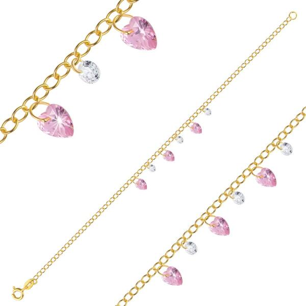 A 925 ezüst karkötő arany színben, vékony ovális láncszemekből készült láncból áll. A láncot három rózsaszín szív alakú cirkónia és négy kerek, átlátszó cirkónia díszíti. A karkötő rugós gyűrűzárral rendelkezik. A szívek mérete: 6 x 7 mm. Az átlátszó cirkónia átmérője: 4 mmLánc szélessége: 2 mmA karkötő hossza: 170 mm (+/- 5 %)A karkötő súlya: 2,2