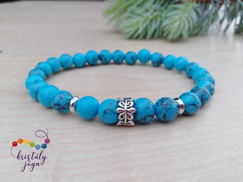 Az amazonit golyók gumira vannak felfűzve. Amit az amazonitról érdemes tudnod: Az amazonit nagyrészt átlátszatlan kő, esetleg halvány tejfehér felhőkkel a világoszöldtől a kékes-zöldön keresztül a sötét zöldig/kékig. Ezt a követ mostanában méltánytalanul mellőzik, pedig sokféle hasznos gyógyhatással bír. Lelki gyógyhatás: Az amazonit nyugtató hatással bír az ide
