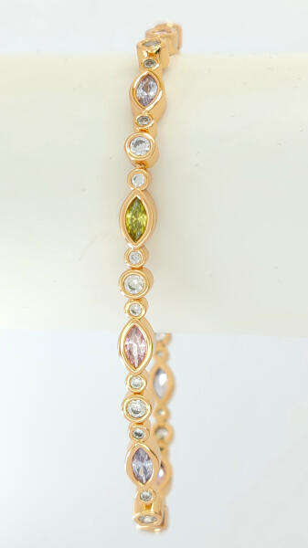 Aranyszínű karkötő, melyet fehér, rózsaszín, halványzöld és lila cirkónia kristályok tesznek csillogóvá. A kristályok ragasztott, peremezett foglalatban helyezkednek el és a karkötő teljes hosszát díszítik. Időtálló ékszer, nem feketedik, nem színezi a bőrt ("gold filled"). Mindennapi használatra is tökéletes választás. Antiallergén ékszer. 18K arany színben kaph