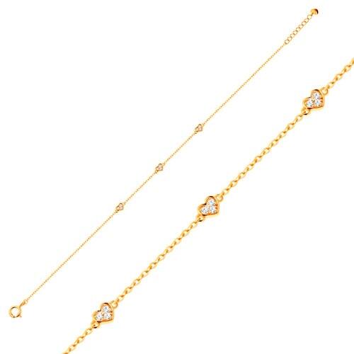 585 sárga arany karkötő, lapos ovális szemekből, amelyeken három szabályos szívecske medál található. A szívek cirkóniákkal vannak kirakva. A karkötő kerekkapcsos zárszerkezettel rendelkezik , hossza állítható, a végén egy kidomborodó szív helyezkedik el. Szív mérete: 3 x 3 mmSzélesség 1 mmHossz: 160 mm Hosszabbítható rész: 20 mmTeljes hossz: 180 mm (+/- 5%)Súly: 0,