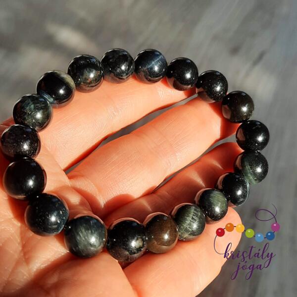 A sólyomszem név nem csak kinézetére utal, hanem arra is hogy jó hatással van a szemproblémákra, szemfáradtságra, fejfájásra. Ez az ásvány segít, hogy nehéz helyzetekben, ne veszítsük el a fejünket, ezáltal a stressz helyzetekben is könnyebben helyt állhatunk. Alkalmazása: ne viseljük egy hétnél tovább, mert gátolja az energiák áramlását. Lelki hatások eléréséé