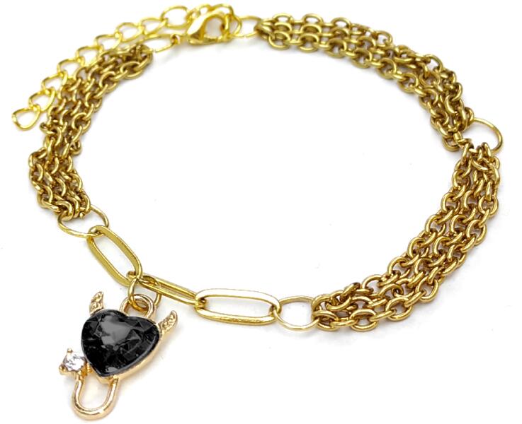Három soros divat karkötő fekete ördög szív charmmal, arany színű. Paraméterek: Charm mérete 2 cm. Anyaga fémötvözet és kristály, karkötő anyaga rozsdamentes acél. Karkötő mérete 17+5 cm. (Ha ettől eltérő méretet szeretnél, rendeléskor a MEGJEGYZÉSBE írd be. )