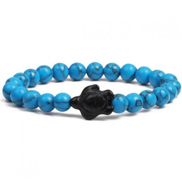 Tortuga Karkötő Modern Tortuga karkötő verhetetlen áron. Kialakításával Önt is biztosan elbűvöli, szépen kiegészíti öltözékét. Az ékszer nem tartalmaz nikkelt, ezért érzékeny bőrű emberek is viselhetik. Tulajdonságok: A karkötő mérete: gumis Szín: Kék Anyaga: ásványgyöngy golyócskák A golyócskák mérete: 0,8cm Díszítése: Teknős