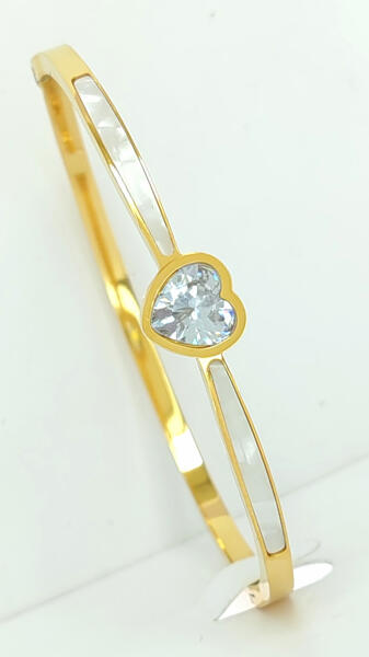 Aranyszínű nemesacél (316L) karperec, melyet fehér cirkónia kristályok tesznek csillogóvá, szív motívum és kagyló belső díszít. A díszítések ragasztott foglalatban helyezkednek el, a karperec elülső felét díszítik. Minőségi, tartós anyagának köszönhetően akár mindennapi viseletnek is alkalmas, nem feketedik, nem színezi a bőrt. Antiallergén ékszer. 14K arany szí