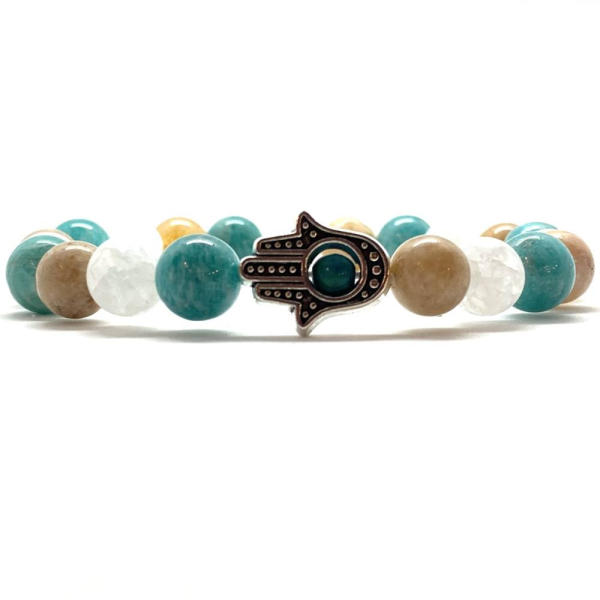 Egyedi ásvány karkötő Hamsa-védelmező kéz dísszel A 8mm-es Amazonit, Hegyikristály és Achátok ásvány golyók gumis damilra vannak felfűzve, Hamsa kéz díszítéssel. Amit az achátokról tudni kell: Az achát rengeteg színben fellelhető, többnyire szürke, kékesszürke, zöldesszürke, szürkésfehér, barna csíkos, áttetsző. Az achátok testi és lelki hatásai: Tisztítja a