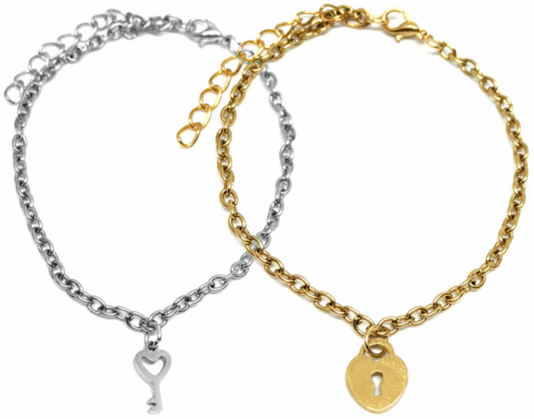 Szív Kulcs és Lakat Szív charmos páros karkötő, ezüst és arany színű. Paraméterek: Charmok mérete 1,2 cm. Anyaguk nemesacél, karkötők anyaga rozsdamentes acél. Karkötők mérete 17+5 cm. (Ha ettől eltérő méretet szeretnél, rendeléskor a MEGJEGYZÉSBE írd be. )