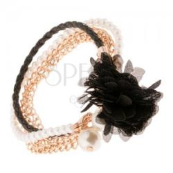 Multikarkötő, amely három arany színű láncból, fonott fekete bőr sávból és egy gyöngyös vonalból áll fehér színben. A karkötő két fényes, bézs golyóval és egy fekete színű virággal van díszítve. A virág átlátszó cirkóniákkal van kirakva. Szélesség: 12 mmHossz: 170 mmA virág átmérője: 35 mm