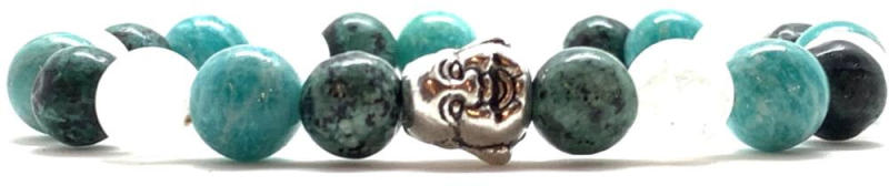 Egyedi ásvány karkötő Buddha fej köztes dísszel A 8mm-es zöld Crazy Achát, Hegyikristály és Amazonit ásvány golyókból készült karkötők speciális gumis damilra vannak felfűzve dagi buddha fej köztes díszítésselAmit az achátokról tudni kell: Az achát rengeteg színben fellelhető, többnyire szürke, kékesszürke, zöldesszürke, szürkésfehér, barna csíkos, áttetsző