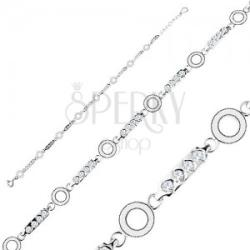 925 ezüst karkötő hosszúkás elemekből, amelyekbe négy csillogó cirkóniák vannak. Az egyes elemek fényes karikákkal váltakoznak. A karkötő hossza állítható és delfinkapoccsal viselhető. Szélesség: 5 mmHossz: 160 mmHosszabbítható rész: 30 mmSúly: 4,5 gFémjelzéssel ellátott.