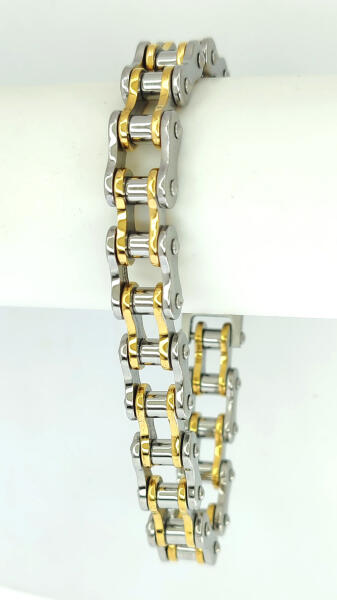 Nemesacél (316L) motorlánc karkötő arany-ezüst színben. Tartós, időtálló ékszer, nem feketedik víz hatására sem. Mindennapi viseletre is tökéletes választás. Antiallergén ékszer. 14K arany-ezüst színben kapható. Karkötő szélessége: 12 mm. Karkötő hossza: 21,3 cm. Igény szerint rövidíthető, melyet ajándékként elvégzünk. A kért méretet kérjük a megjegyzés r