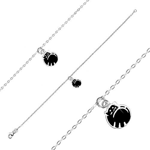 A 925 ezüst karkötőt apró ovális láncszemek alkotják, amelyek egymásra merőlegesen vannak összekapcsolva. A fényes láncon egy kisebb medál található, amely egy összegömbölyödött macskát ábrázol. A medál elejének felületét fekete színű fénymáz díszíti. A medál hátulja fényes. Delfinkapocs. A díszes rész mérete: 10 x 12 mmA lánc szélessége: 1,1 mmA karkötő