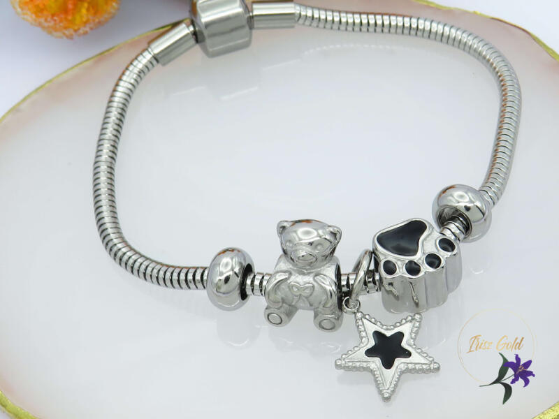 Nemesacél macis pandóra stílusú karkötő Maci , tappancs, csillag charm diszitessel Szin: ródium Méret: 18 cm A forgalmazott divatékszerek alapanyaga nikkel és ólommentes ezért többnyire nem okoznak allergiás tüneteket, nyugodtan hordhatják fémérzékeny emberek is. Általában nem színezik a bőrt és más divatékszerekhez képest nagyságrendekkel jobb kopásállósággal rende