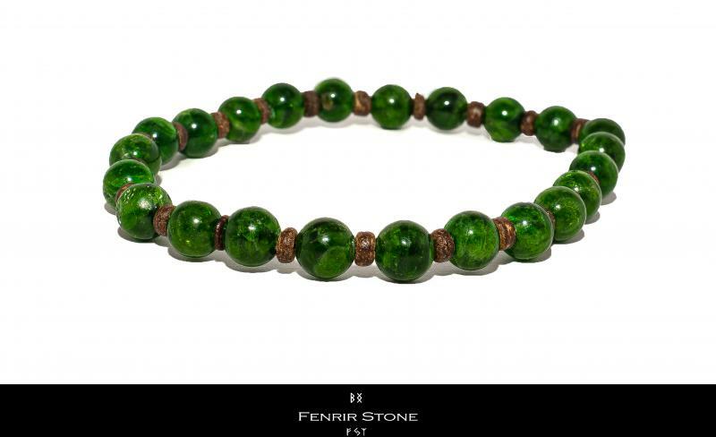 Lelőhelye: Oroszország, Sakha, Aldan, Inagli A golyók között természetes kókuszfa található. A golyók átmérője: 8,6 mm. A Króm Diopszid, egy nagyon ritka, élénkzöld ásvány, amely évek óta elbűvöli a drágakövek szerelmeseit. Élénk zöld színét a benne található króm és vas jelenlététől kapja. Míg a Diopszidok többféle színben kaphatók, beleértve a fekete-fe