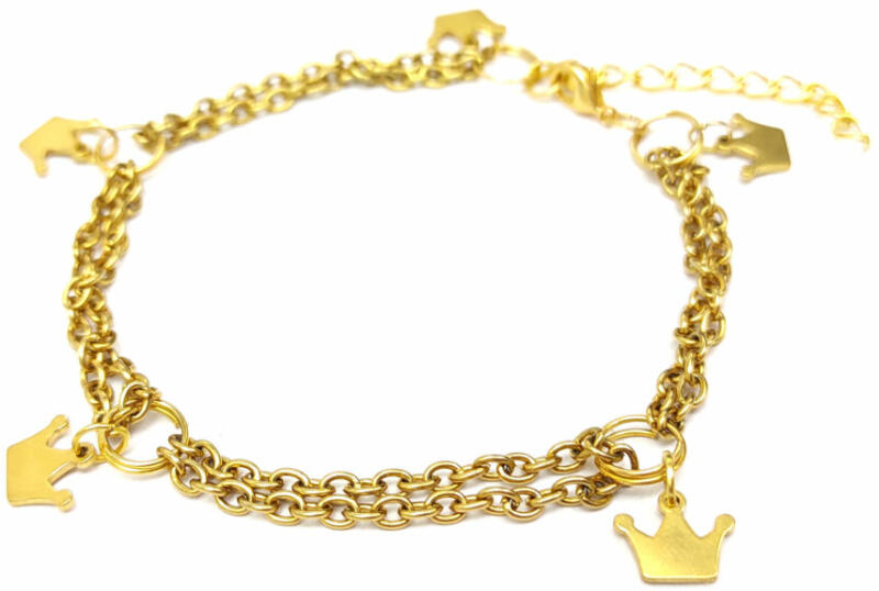 Korona charmos karkötő, 5 charmmal. Paramé terek: Charm mérete 1 cm. Anyaga nemesacél, karkötő anyaga rozsdamentes acél. Karkötő mérete 17+5 cm. (Ha ettől eltérő méretet szeretnél, rendeléskor a MEGJEGYZÉSBE írd be. )