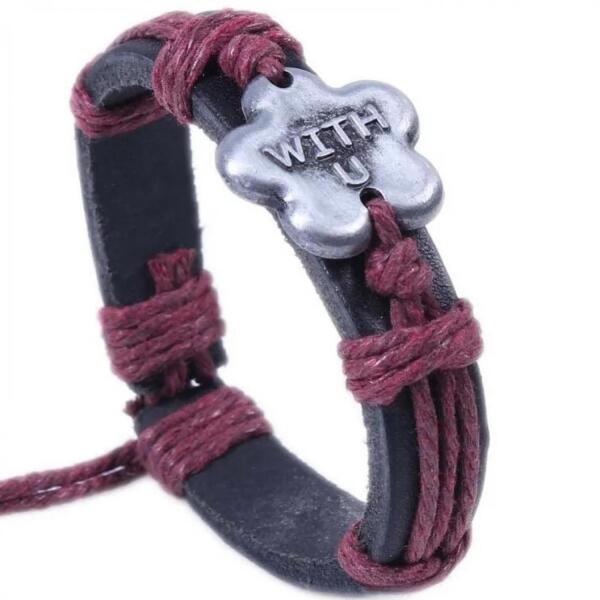Gohan Karkötő A Gohan karkötő több, mint egyszerű divatkiegészítő - az összetartozás és a támogatás szimbóluma. Ez az egyedi karkötő sötét színű műbőrt kombinálja a borvörös zsinórral, amelyet rátekertek. A kakrötőt virág alakú medál díszít, amelyen "WITH U" felirat olvasható. Az erős és tartós anyagok biztosítják, hogy a karkötő kibírja a mindennapos vi