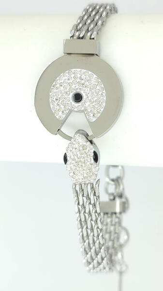 Ezüstszínű nemesacél (316L) fonott karkötő, melyet kígyó fej díszít és fehér cirkónia kristályok tesznek csillogóvá. A kristályok ragasztott foglalatban helyezkednek el. Tartós, minőségi anyagának köszönhetően nem kopik, nem színeződik, mindennapi viseletre is alkalmas. Antiallergén ékszer. Hosszúsága: 18 cm + 3,5 cm hosszabbító. Karkötő szélessége: 6 mm. Minta