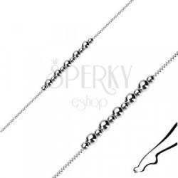 925 ezüst bokalánc tükörfényes nagyobb és kisebb gyöngyökkel, amelyek a lánc közepén rögzítettek. A lánc szögletes elemekből épül és nagyobb szemekkel végződik. A lánc delfinkapcsos és hosszabbítható. A lánc szélessége: 0,7 mmA lánc hossza: 230 mmA toldólánc hossza: 25 mmA lánc teljes hossza: 255 mm (+/- 5 %) A kisebb gyöngy átmérője: 2 mmA nagyobb gyöngy átm