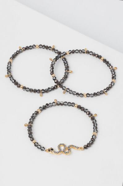 - Elasztikus szalag karkötők. - Dekoratív gyöngyök. - Kígyó alakú és szabálytalan alakú díszítőelemek. - Kerület: ok. 17,5 cm.