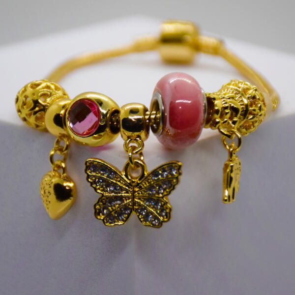 Elegáns női arany színű pillangós Pandora stílusú karkötő, 19 cm hosszú és 2 mm vastag. Tökéletes kiegészítő minden alkalomra. Az arany színű pillangós Pandora stílusú karkötő igazi csodaszép ékszer darab, mely a legnagyobb figyelmet vonja magára bármelyik alkalom során. Kiváló minőségű anyagból készült, 19cm hosszú és 2mm vastag, ami ideális méretet biztos