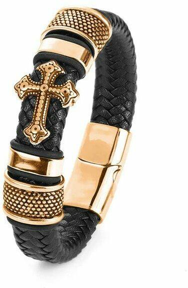 Műbőr karkötő, fekete-arany színű. Kereszt dísszel. Erőteljes, határozott stílusú férfi karkötő, látványos ékszer. Hossza 22 cm, anyaga műbőr és fémötvözet.