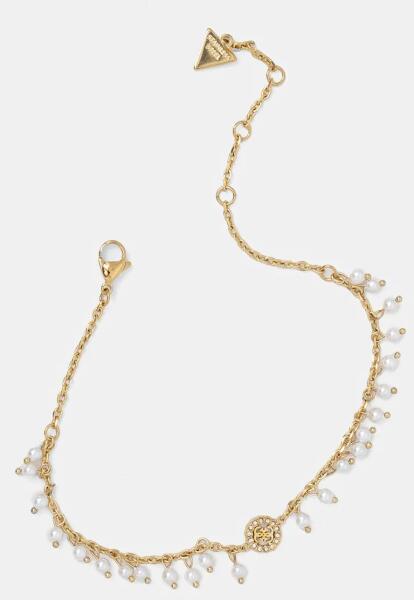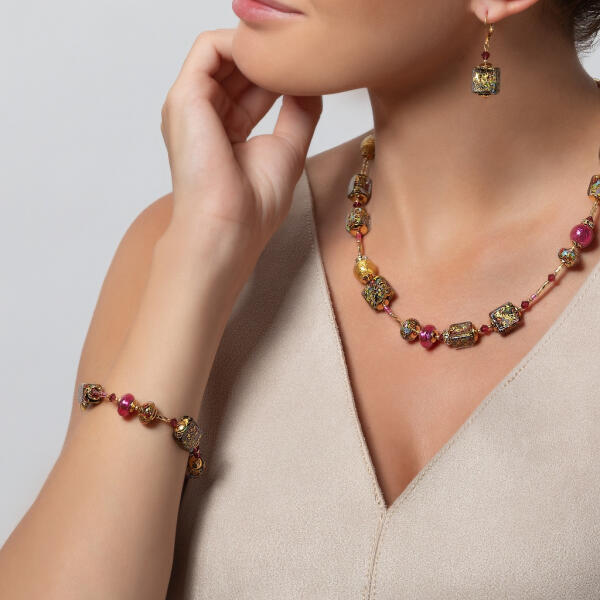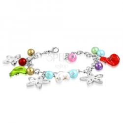Karkötő fényes, egymásba kapcsolódó láncszemekből. A láncról különböző medálok függnek, szintetikus gyöngyök, üveggyöngyök és virág körvonalak. A lapos üveggyöngyök enyhén hajlított formájúak. Mindkét oldalról rózsák díszítik. Zárszerkezete delfinkapcsos. Szélesség: 6 mmHossz: 240 mm (+/- 5%)Legnagyobb medál mérete: 23 x 26 mmA gyöngyök színbeli sorrend
