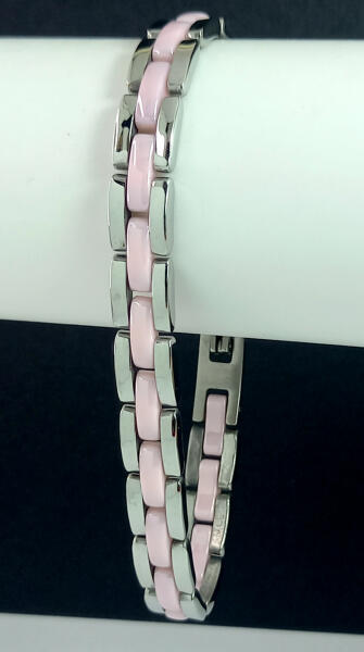 Egyszerűségében is mutatós nemesacél (316L) karkötő rózsaszín kerámia betéttel. Mindennapi használatra is alkalmas, nem törékeny, nem kopik, bármely ruha tökéletes kiegészítője. Minőségi, tartós ékszer. Antiallergén ékszer. Hosszúság: 21 cm. Szélesség: 8 mm. A nemesacél ékszerek rendkívül népszerűek kedvező tulajdonságaik miatt. A nemesacél semmilyen nikkels