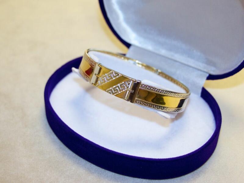 Modern stílusú, görög mintával és ródiummal díszített, szögletes profilú, arany férfi karperec.