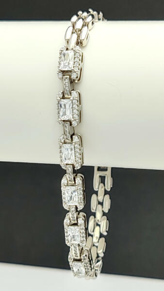 Ezüstszínű karkötő, melyet fehér cirkónia kristályok tesznek csillogóvá. A kristályok a karkötő első harmadát díszítik. A kristályok karmos foglalatban helyezkednek el. Időtálló ékszer, nem feketedik, nem színezi a bőrt ("gold filled"). Mindennapi használatra is tökéletes választás. Antiallergén ékszer. Karkötő szélessége: 6 mm. Az antiallergén ékszerek olyan f