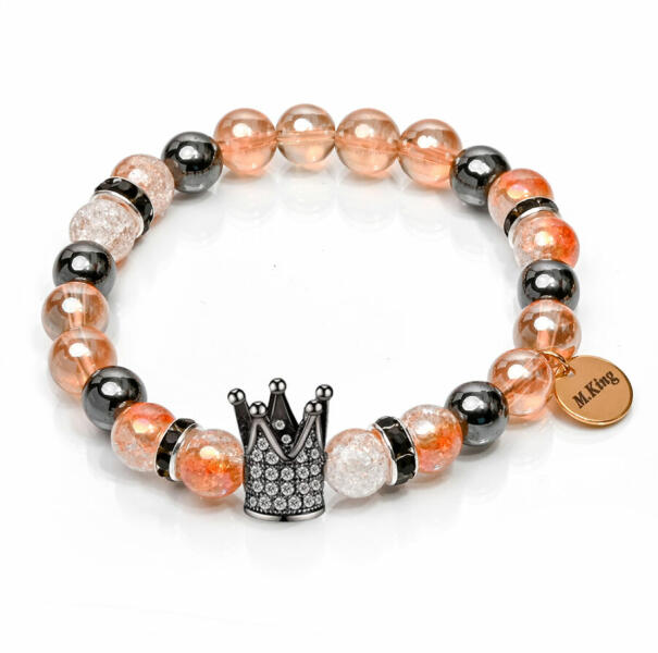 Különleges csillogású angyal aura, hegyikristály és hematit karkötő, remek kiegészítő lehet alkalmi, de akár sportos öltözékhez is. A korona dísz gyönyörűen kidolgozott, még tovább emeli a karkötő fényét. Figyelem! A képen exkluzív kivitelű, rugalmas karkötő látható kapocs nélkül, de kérheted extra erős acélsodronyra is delfinkapoccsal és 5 cm hosszabbítólá