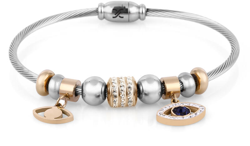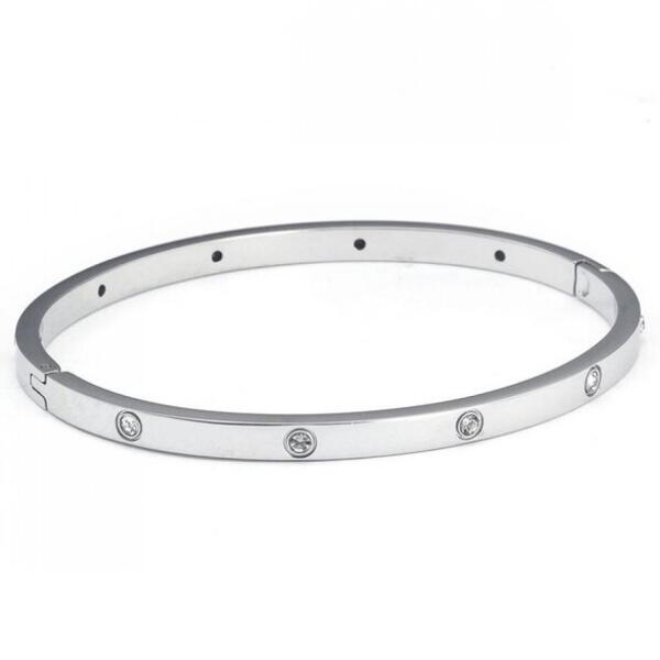 Aisha Karkötő Szépséges Aisha merev karkötő kedvező áron. A karkötőt cirkónia ékkövek díszítik. A karkötő 4 különböző szélességgel kapható, így kombinálhatja őket, többet is viselhet egyszerre. Az ékszer nem tartalmaz nikkelt, ezért érzékeny bőrű emberek is viselhetik. Tulajdonságok: A karkötő átmérője: 17cm Szélessége: 4mm Anyaga: Fém és cink ötvözete