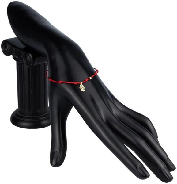 A karkötő egy hét csomóval ellátott piros zsinórral és egy 585 arany gyönggyel. A díszítő részen Fatima keze látható, finoman strukturált felülettel, sima díszítéssel és szegéllyel. A karkötő állítható hosszúságú, hossza arany gyöngyökkel díszített húzózsinórral állítható. Szélesség: 1 mmHossz: 130 mmHosszabbító zsinór hossza: 70 mTeljes hossz a hosszabb