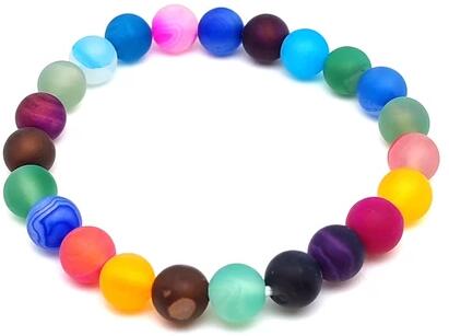 Achát vegyes karkötő (golyó sáv matt szinezett Kína Karkötő ásvány)Az ásvány golyók gumira vannak felfűzve. Az ásványok színbeli aránya eltérhet a képen láthatótól. Amit az achátról érdemes tudnod: Az achát minden színben fellelhető, többnyire szürke, kékesszürke, zöldesszürke, szürkésfehér, barna csíkozással, áttetsző. Lelki gyógyhatás: Az achát lelki