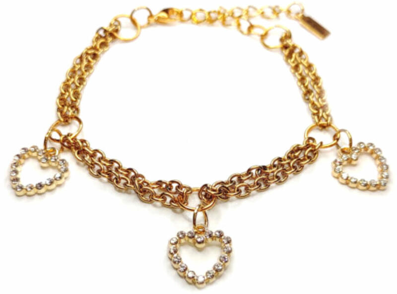 3 Kristály szív charmos arany színű dupla karkötő. Paraméterek: Charm mérete 1,3 cm. Anyaga fémötvözet és kristály, karkötő anyaga rozsdamentes acél. Karkötő mérete 17+5 cm. (Ha ettől eltérő méretet szeretnél, rendeléskor a MEGJEGYZÉSBE írd be. )