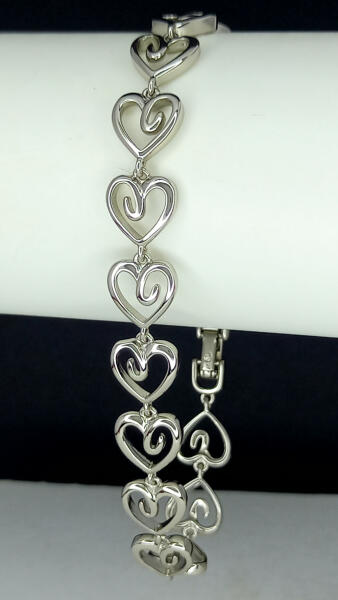 Ezüstszínű karkötő, melyet szív alakú szemekből alakítottak ki. Időtálló ékszer, nem feketedik, nem színezi a bőrt ("gold filled"). Mindennapi használatra is tökéletes választás. Antiallergén ékszer. Karkötő szélessége: 9 mm. Az antiallergén ékszerek olyan fémötvözetből készülnek, melyek nem irritálják a bőrt, nem okoznak allergiás reakciókat, ezért fémre