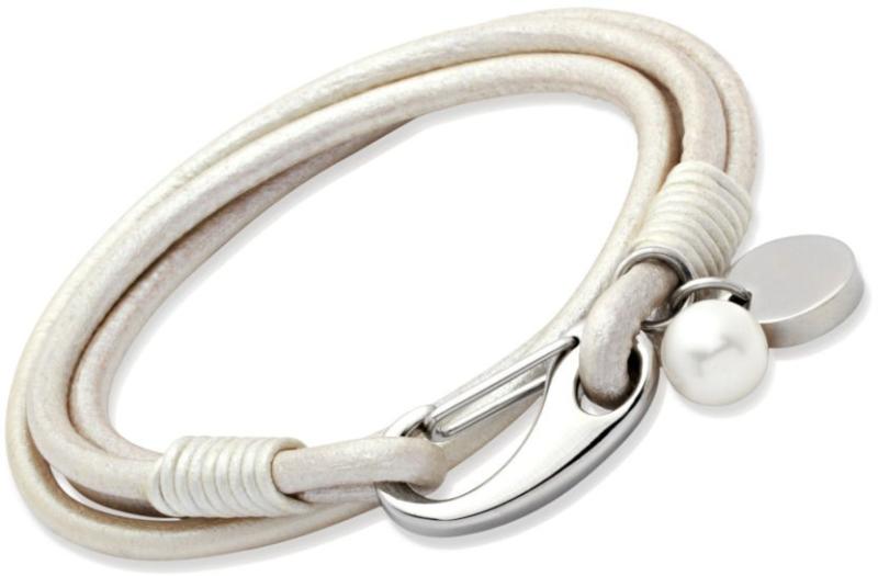 Rozsdamentes acél és bőr karkötő. Természetes bőr és rozsdamentes acél. Gyöngyházfehér szín. Különleges díszek a karkötőn: természetes gyöngy és medál Biztonsági zár. 19 cm-es méretben. Cikkszám : B67PE Szín : Gyöngyházfehér Karkötő anyaga : Rozsdamentes acél és bőr Méretválaszték : 19 cm Nikkelmentes : Igen Vízállóság : nem vízálló Garancia : A termék