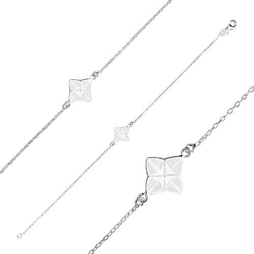 A 925 ezüst karkötő egy fényes láncból és egy stabilan rögzített medálból áll. A láncot egymásra merőlegesen összekapcsolt, ovális szemek alkotják. A négyágú csillag alakú medál eleje díszesen metszett. Minden ágát két háromszög alakú kivágás díszíti, amelyek fehér fénymázzal vannak kitöltve. A csillag közepén két egymásra merőleges bemetszés helyezkedik