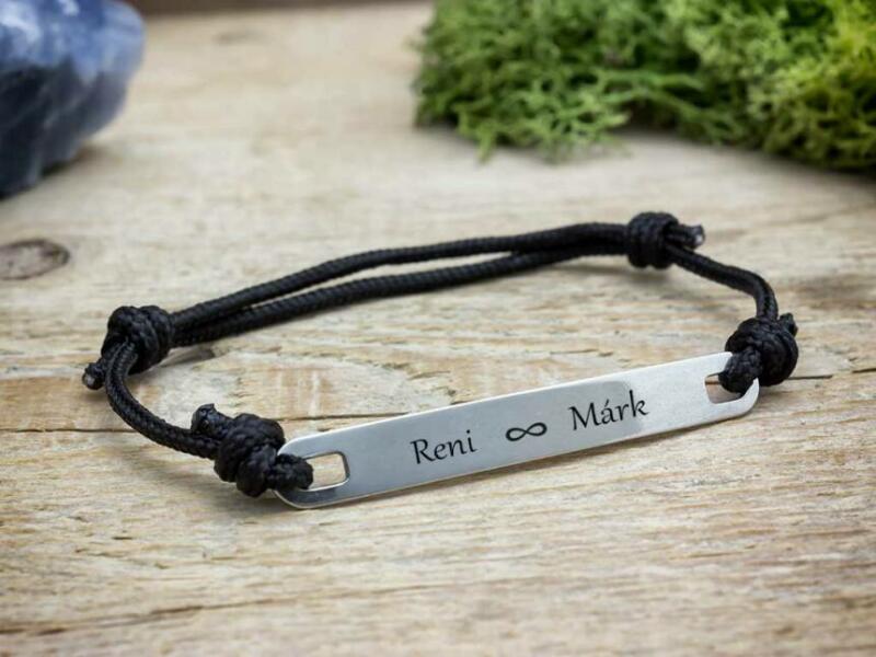 Ezt az egyszerű, de mégis egyedi karkötő ajándék ötlet ünket e gy microcord zsinór , és egy acél medál alk ot ja . A karkötőt egy lap alakú 49×6,3 mm-es méretű elegáns acél medál díszíti, amit gravírozunk , így személyesebbé téve az ajándékot . A nemesacél más néven orvosi fém medál nem allergizál , ezért fémre érzékenyeknek is bátran ajánljuk . Mindemelle
