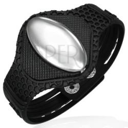 A fekete órastílusú karkötő gumiból készült. A görög stílusó sormintával díszített pánt középen kiszélesedik, fényes, ovális sebészeti acél lapocska díszíti. Patenttal záródik. Szélesség: 13 - 38 mmHosszúság: 215 mm