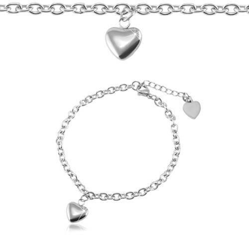 Az ezüst színű acél karkötő nagyobb ovális formájú szemekből áll. Középen egy fényes kidomborodó szív van odafogatva. A másik kisebbik szív a hosszabbítható rész utolsó láncszeméhez van fogatva. Delfinkapoccsal záródik. Szélesség: 4 mmHossz: 185 mmHosszabbítható rész: 30 mmTeljes hossz: 215 mm (+/- 5 %) Medálok méretei: 8 x 8 mm és 9 x 9 mm