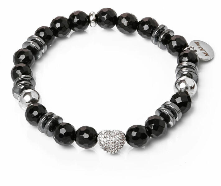 Gyönyörű ónix és hematit karkötő, különleges ezüstök és feketék kombinációja, megkoronázva egy remekül kidolgozott cirkóniummal kirakott szív dísszel. A hematit korongoktól még egyedibb az összhatás. Vagány, mégis kifinomult ékszer. Különböző fémes csillogásokkal szemet gyöngyörködtet. Ha szív dísz nélkül kéred a karkötőt, írd be megjegyzésbe! Figyelem!