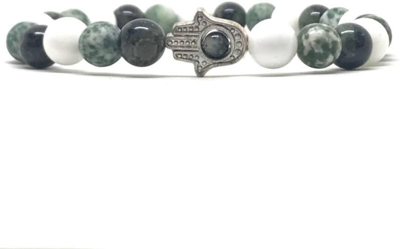 Egyedi ásvány karkötő Hamsa-védelmező kéz dísszel A 8mm-es Mohaachát, Jáde és Faachát ásvány golyókból készült karkötők speciális gumis damilra vannak fűzve, hamsa kéz díszítéssel. Amit az achátokról tudni kell: Az achát rengeteg színben fellelhető, többnyire szürke, kékesszürke, zöldesszürke, szürkésfehér, barna csíkos, áttetsző. Az achátok testi és le