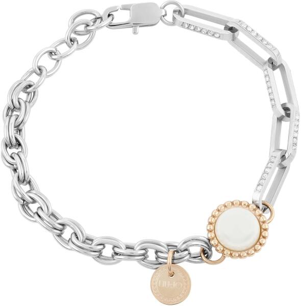 585 kombinált arany karkötő vékony lánccal és medállal. A medált végtelen szimbólum díszíti melynek felületén bemélyedés található fehér arany bevonattal és apró, kerek, átlátszó cirkóniákkal. A vékony láncot merőlegesen összekapcsolódott ovális szemek alkotják. A karkötő állítható hosszal és delfinkapcsos zárszerkezettel rendelkezik. A medál méretei: 11 x
