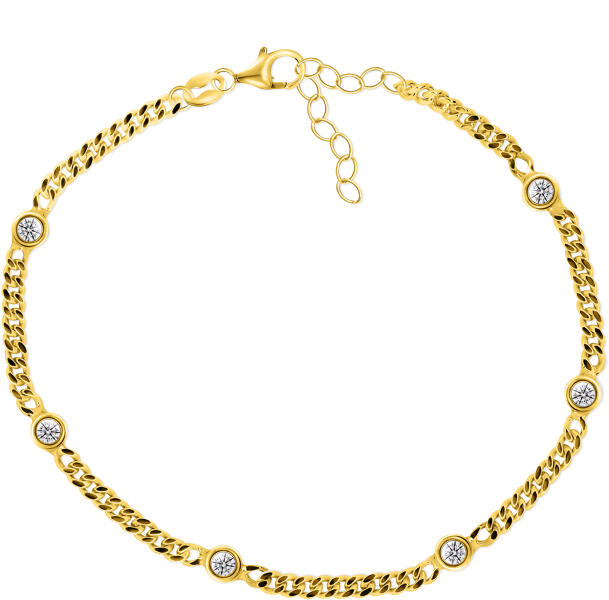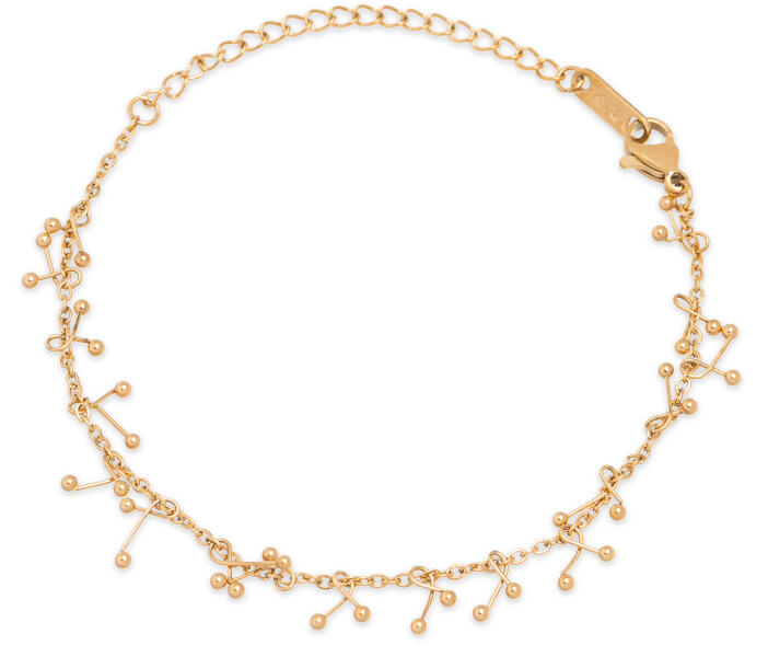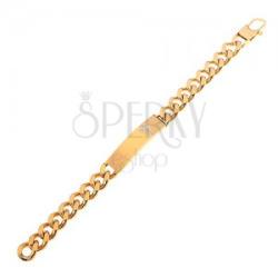 Sebészeti acél karkötő arany színben. A karkötőt hajlított, ellipszis alakú szemekből álló, vastag lánc alkotja. A karkötő közepén egy fényes, hosszúkás tábla található, amelyet az egyik oldalon egy átlátszó cirkóniákból álló kereszt díszít. A karkötő delfinkapcsos zárszerkezettel rendelkezik. Vastagság: 11 mmHossz: 210 mm (+/- 5 %)Tábla méretei: 11 x 42 mm