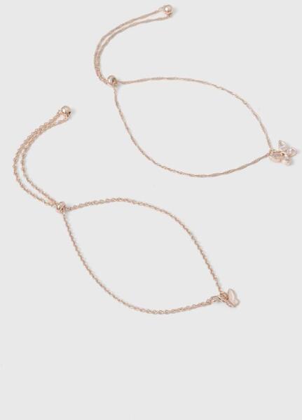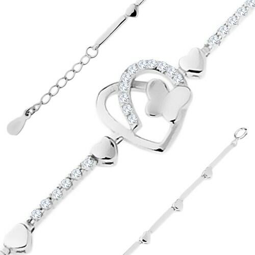 925 ezüst karkötő, hosszúkás fényes elemekből, amelyek szívecskékkel váltakoznak. A díszített részt egyenes vonalak alkotják cirkóniákkal kirakva és szabálytalan szív körvonal, amely egy részén átlátszó cirkóniák találhatóak valamint tükörfényes pillangó. A karkötő hossza állítható, delfinkapoccsal viselhető. Díszített rész: 46 x 12 mmSzélesség: 3 mmHoss