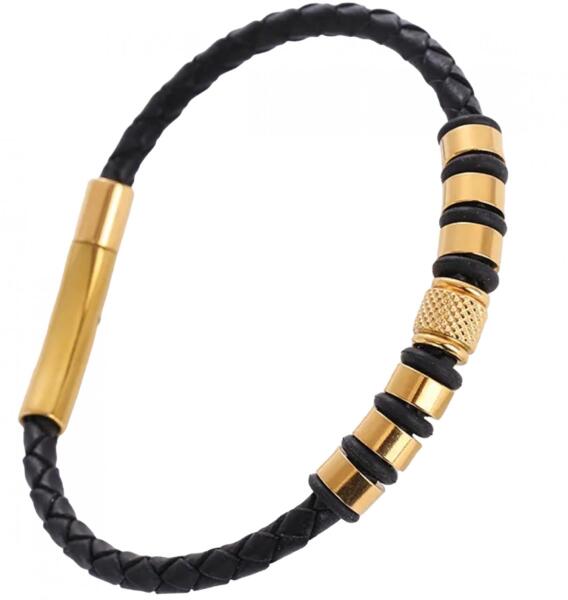 George karkötő Ez az elegáns karkötő a modern stílust luxuselemekkel ötvözi, a fekete fonott bőr és az arany részlet révén. Ideális olyan férfiak számára, akik kifinomult kiegészítőt keresnek, amely kiemeli személyiségüket. Az arany fém elemek egyedi megjelenést kölcsönöznek a karkötőnek, amik a fekete bőr struktúrával kontrasztban érdekes vizuális hatást hoznak